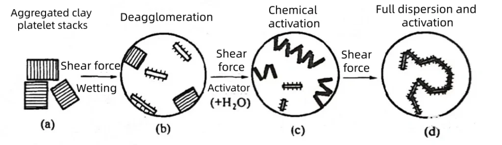 First, under shear force, the solvent or resin solution enters the capillary pores, wetting the agglomerated platelet stacks [Figure a], causing them to deagglomerate [Figure b]. At this point, the system’s viscosity increases significantly. An activator is added under shear conditions to increase the distance between the platelets [Figure c]. Continued shear force fully disperses the platelets, resulting in the activated thixotropic structure [Figure d], known as bentonite gel. In the pre-gel process, the role of the activator is to dissociate and disperse the bentonite platelets and introduce water into the hydrophobic organic solvent to ensure the hydrogen bond strength of the bentonite network. The most commonly used activators are low molecular weight alcohols, such as methanol or ethanol.